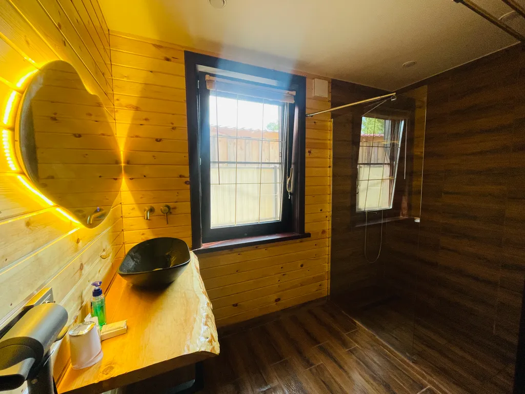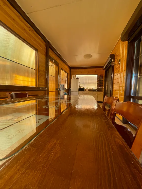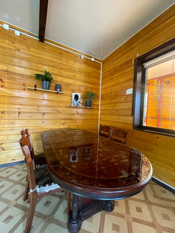 Основной дом: ванная комната (туалет, душ, раковина, шампунь, гель для душа), кухня (чайник, кофеварка, плита, холодильник, большой обеденный стол и стулья на 8 человек), спальные места (двухспальная большая кровать, диван 3 метра, мягкий уголок возле окна). Также в основном доме имеется камин, телевизор, колонка, большая веранда с огромным дубовым столом.