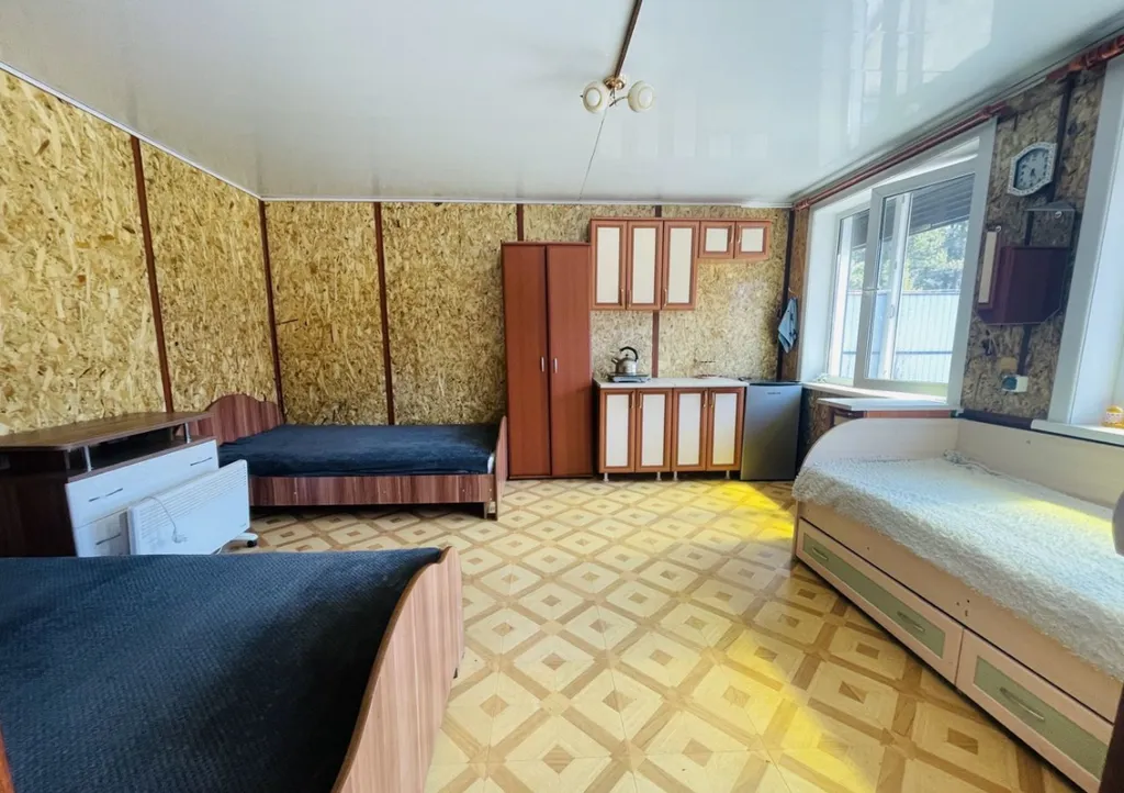 Гостевой дом: спальные места (две полутороспальные кровати, одна кровать односпальная), холодильник, плита, чайник.
