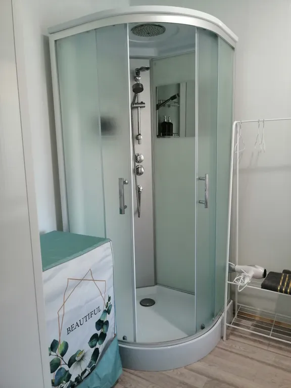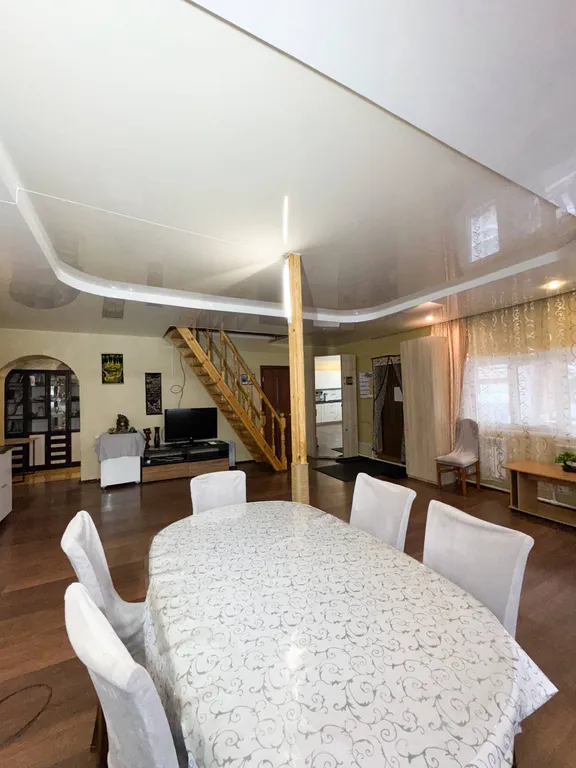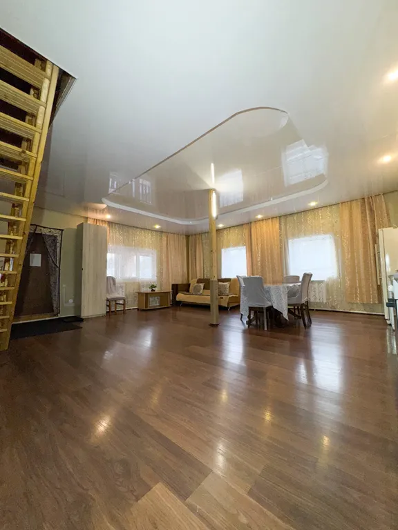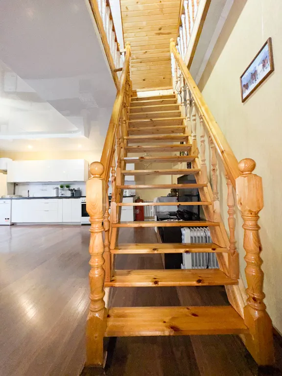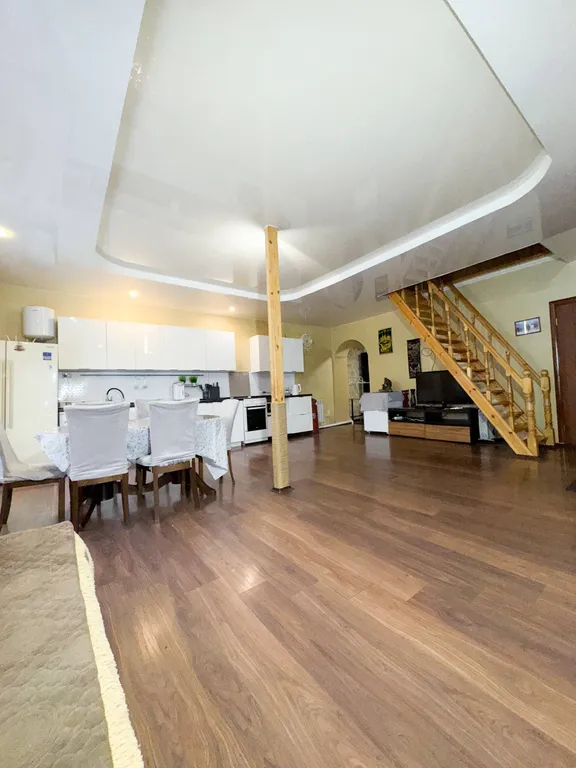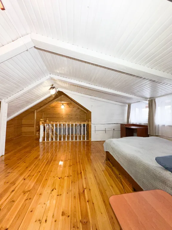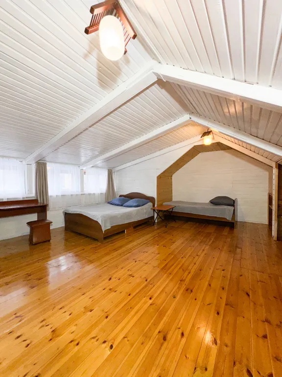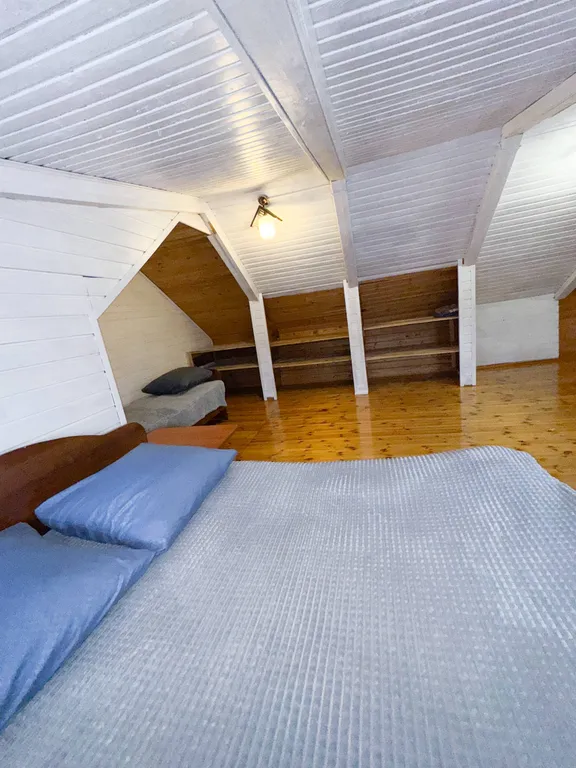 В доме просторная гостиная, совмещенная с кухней. На первом этаже две раздельные комнаты и отдельная комната на втором этаже; душ и туалет в доме.
