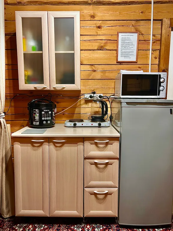 Вход у каждого номера отдельный, с разных сторон. Отдельные территории без посторонних. В каждом номере душ, санузел, мини кухня, посуда, кухонные принадлежности, холодильник, микроволновка, мультиварка, чайник, фен, телевизор, wifi, интерактивное кабельное телевидение. Электрическое отопление, в каждом номере есть печь-камин (дрова бесплатно).