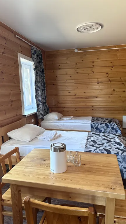В номере есть все удобства для комфортного отдыха - три односпальные кровати (при необходимости можно соединить в двуспальную), теплые полы, санузел и душевая кабина в номере, предметы личной гигиены, фен, телевизор, чайник и чайный набор.