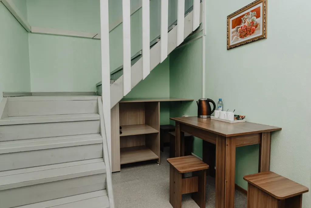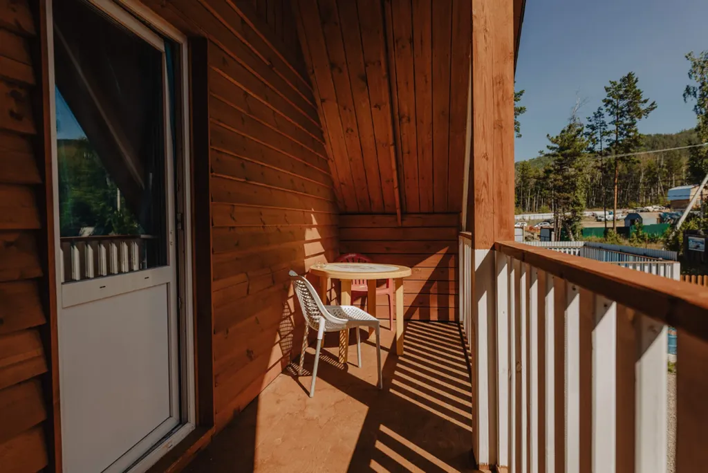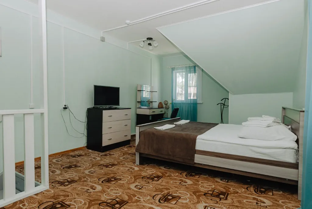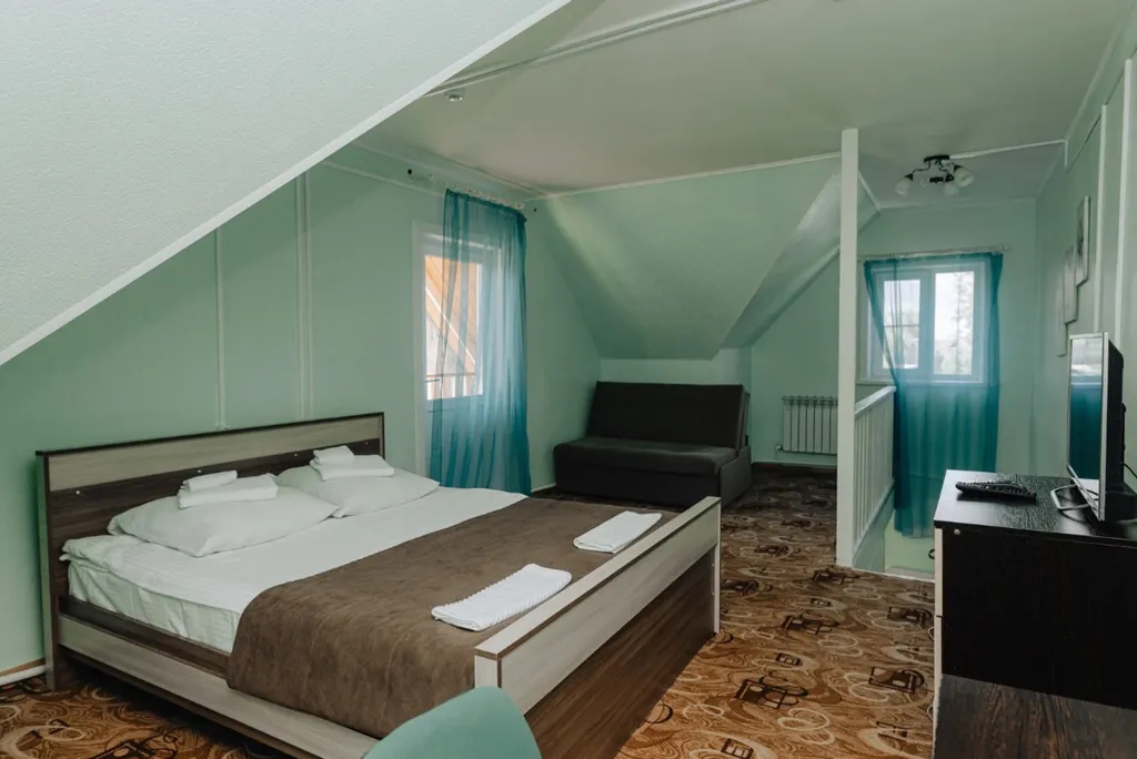 На втором этаже: двуспальная кровать, диван раскладной, комод и дамский столик. Также на втором этаже большой балкон с видом на территорию. Гостям предоставляются полотенца, фен, одноразовые средства гигиены. Также в номере чайник, чайная пара, чай и кофе.
